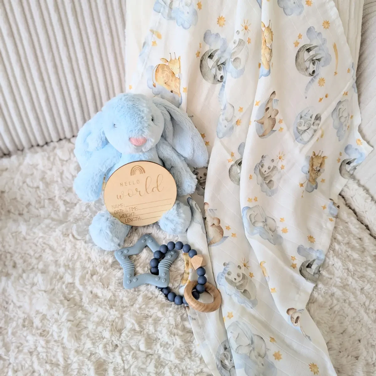 This four-piece collection includes a plush bunny companion, a breathable illustrated muslin, a natural wooden milestone plaque and a silicone star teether—each chosen to offer comfort, sensory play and a keepsake touch new parents will treasure.