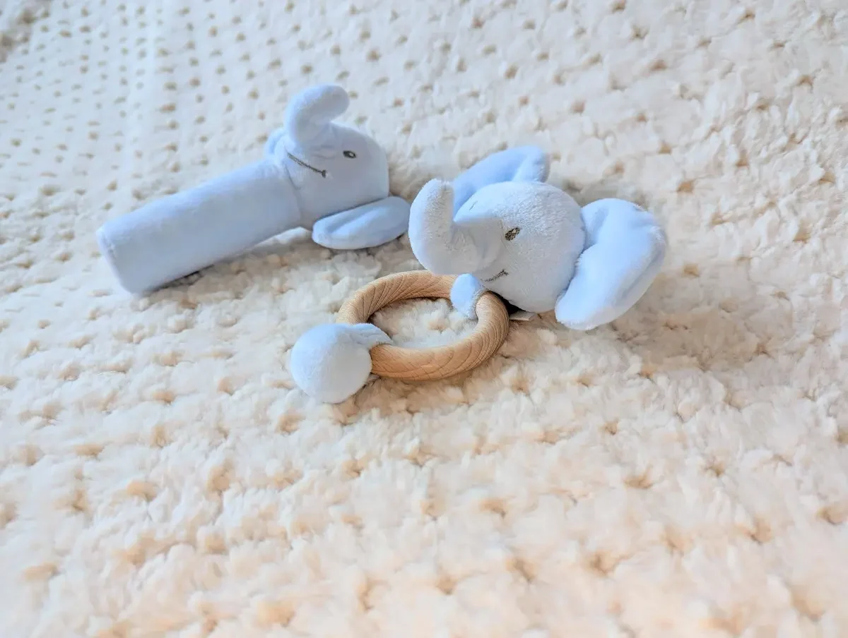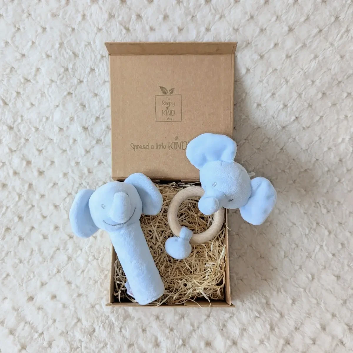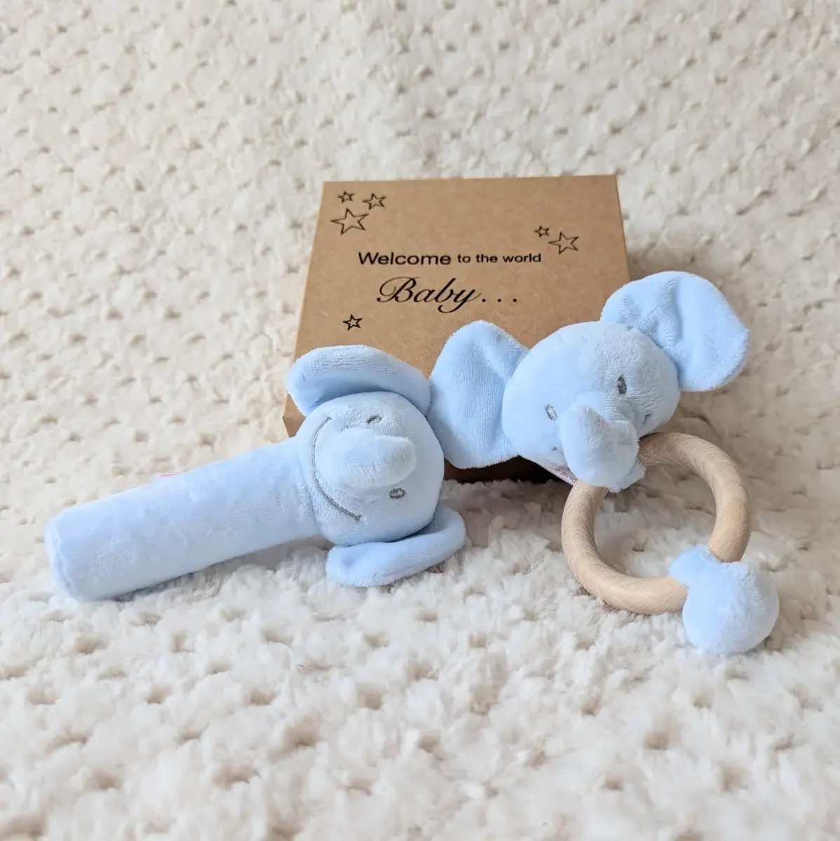 Welcome a little one with this adorable Blue Elephant Rattle & Squeaker Gift Set, designed with sustainability and baby’s comfort in mind. Each set includes a soft plush elephant squeaker and a matching elephant rattle with a smooth beechwood teething ring, perfect for soothing sore gums. Made from 100% eco-recycled materials, the squeaker is crafted from recycled plastic bottles, while the teething ring is responsibly sourced wood, ensuring it’s as kind to the planet as it is to baby. Beautifully presented in a natural kraft gift box, complete with personalised name and milestone details, this thoughtful gift is ideal for newborns, first birthdays, or baby showers. With its gentle textures and friendly design, it’s a keepsake parents will cherish and babies will love exploring.