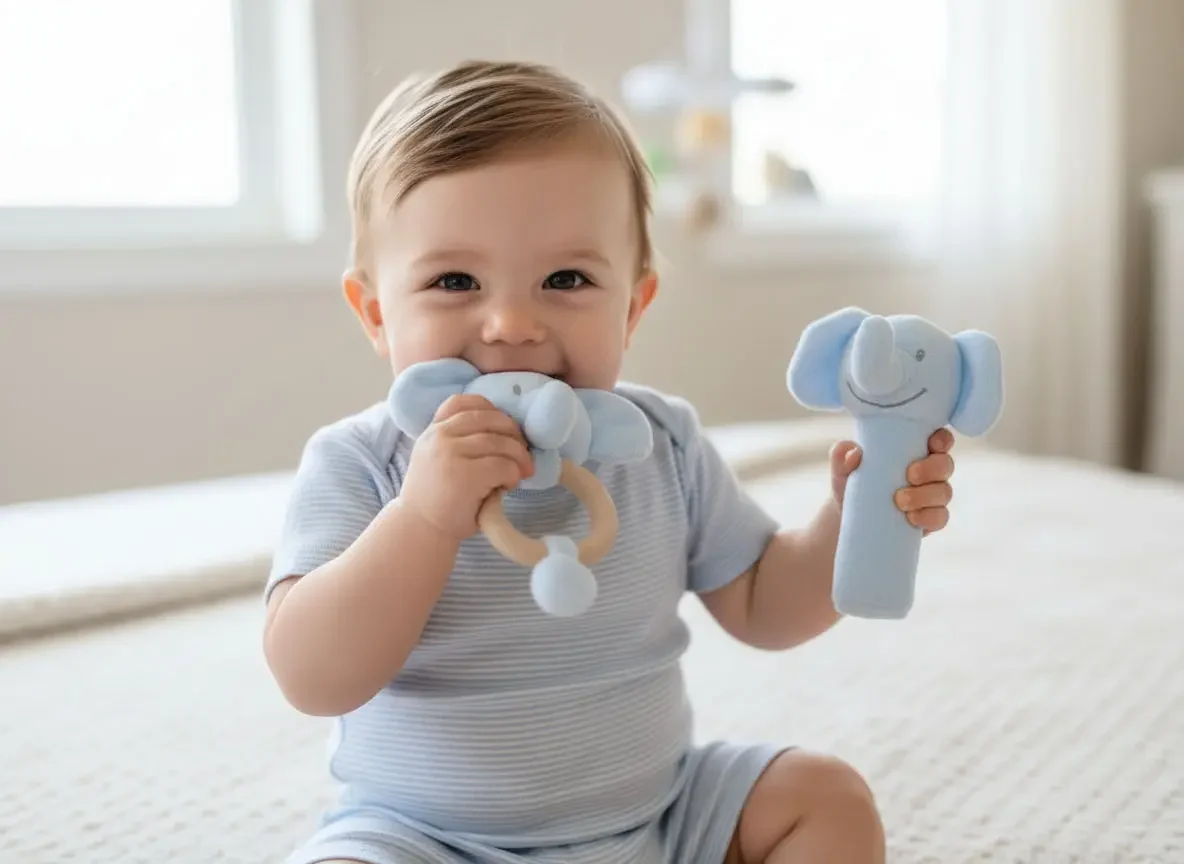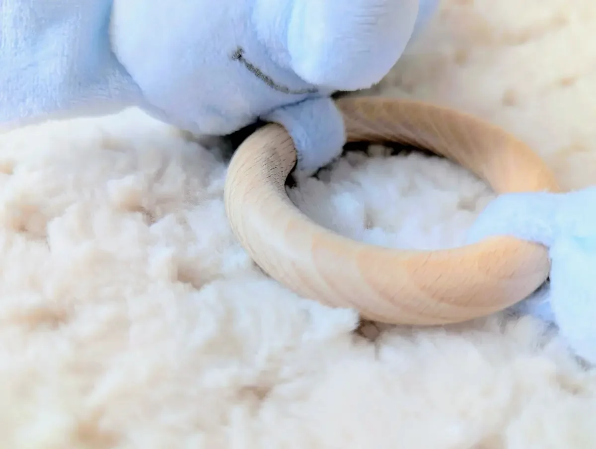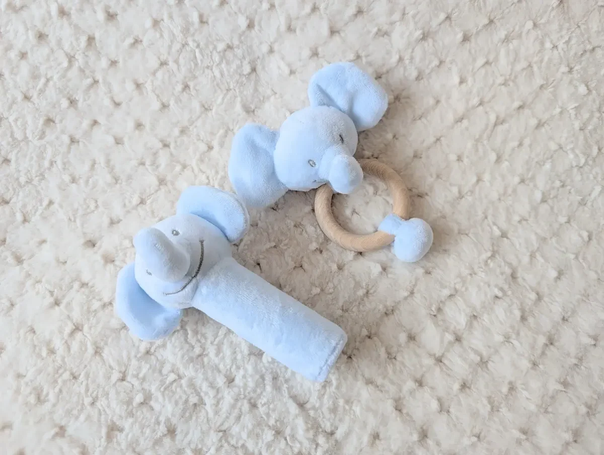 Welcome a little one with this adorable Blue Elephant Rattle & Squeaker Gift Set, designed with sustainability and baby’s comfort in mind. Each set includes a soft plush elephant squeaker and a matching elephant rattle with a smooth beechwood teething ring, perfect for soothing sore gums. Made from 100% eco-recycled materials, the squeaker is crafted from recycled plastic bottles, while the teething ring is responsibly sourced wood, ensuring it’s as kind to the planet as it is to baby. Beautifully presented in a natural kraft gift box, complete with personalised name and milestone details, this thoughtful gift is ideal for newborns, first birthdays, or baby showers. With its gentle textures and friendly design, it’s a keepsake parents will cherish and babies will love exploring.
