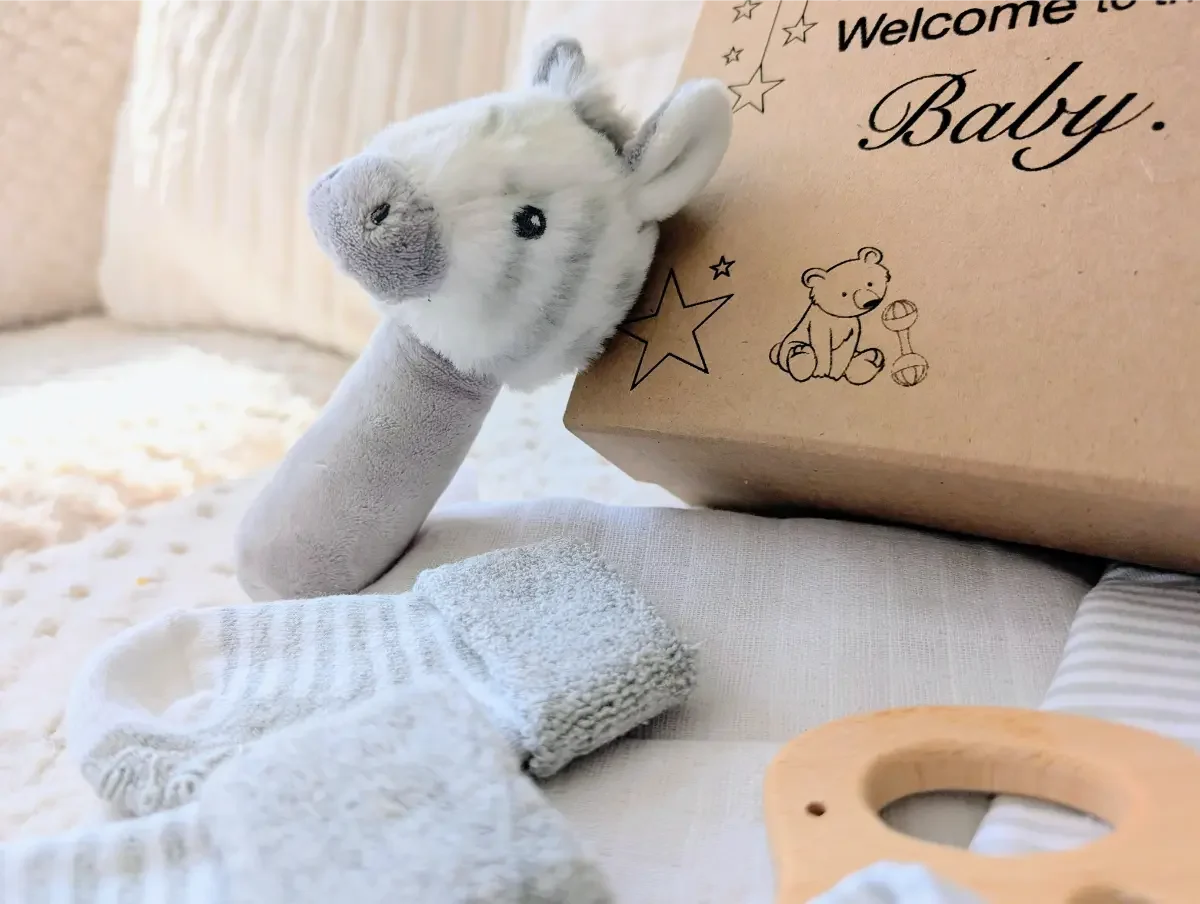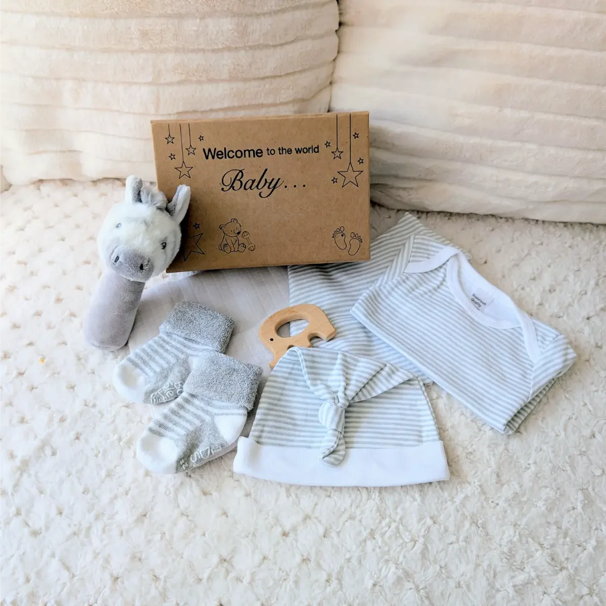 Celebrate a new arrival with the Cuddle Zebra Small Gift Set – a sustainable and stylish choice for baby showers, christenings or first milestones. This delightful set features a soft Keeleco zebra rattle made from recycled plastic bottles, a cosy striped knotty hat and matching striped bodysuit, both crafted from 100% recycled cotton. It also includes a pair of gentle cotton socks and a smooth beechwood elephant-shaped teether, perfect for soothing little gums. Beautifully presented in a natural kraft gift box, complete with personalised name and milestone details, this thoughtful set combines practicality with keepsake value. Designed with comfort, sustainability and charm in mind, it’s a gift that parents will treasure and babies will adore.