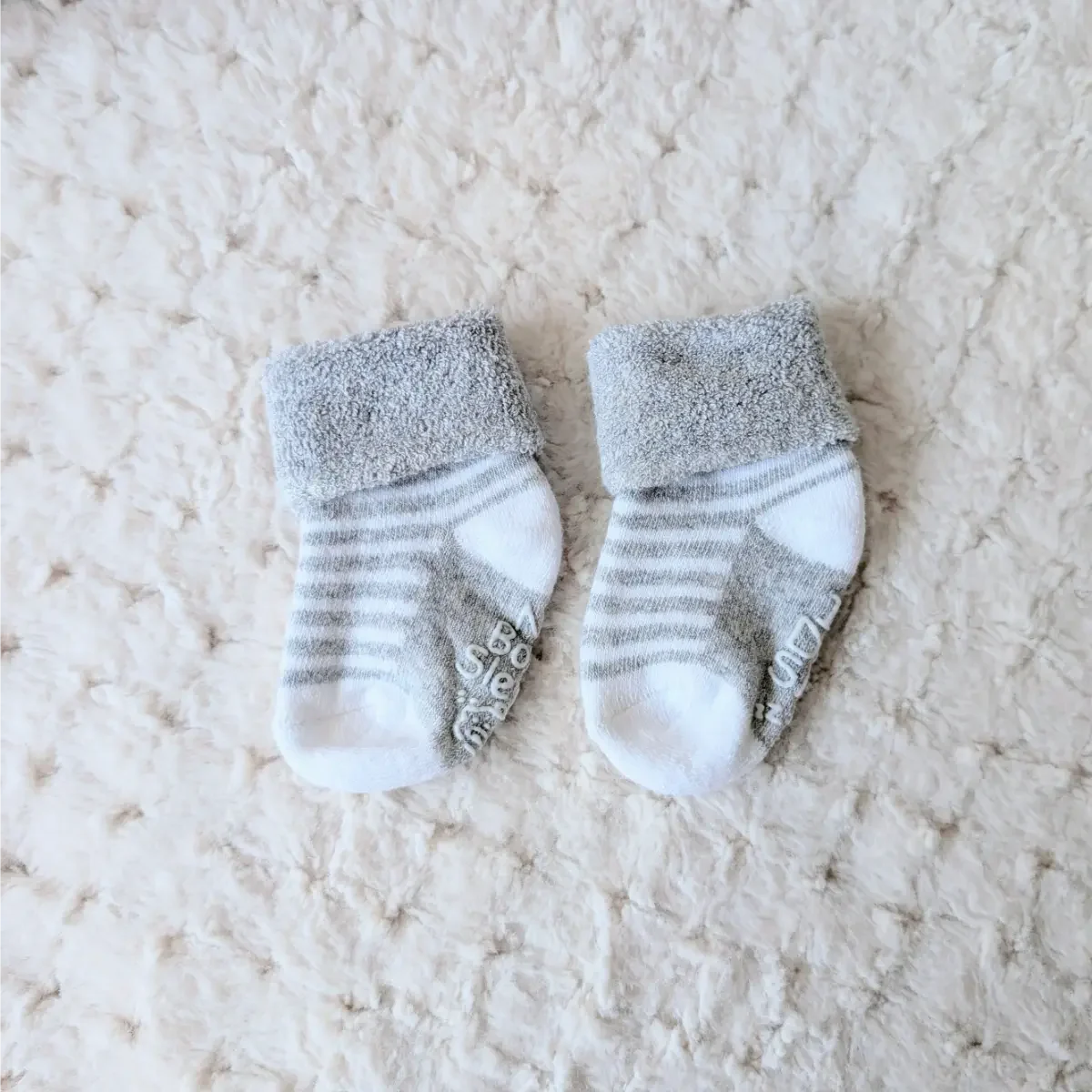 Socks: 100% cotton turnover socks – grey and white 0-3 months