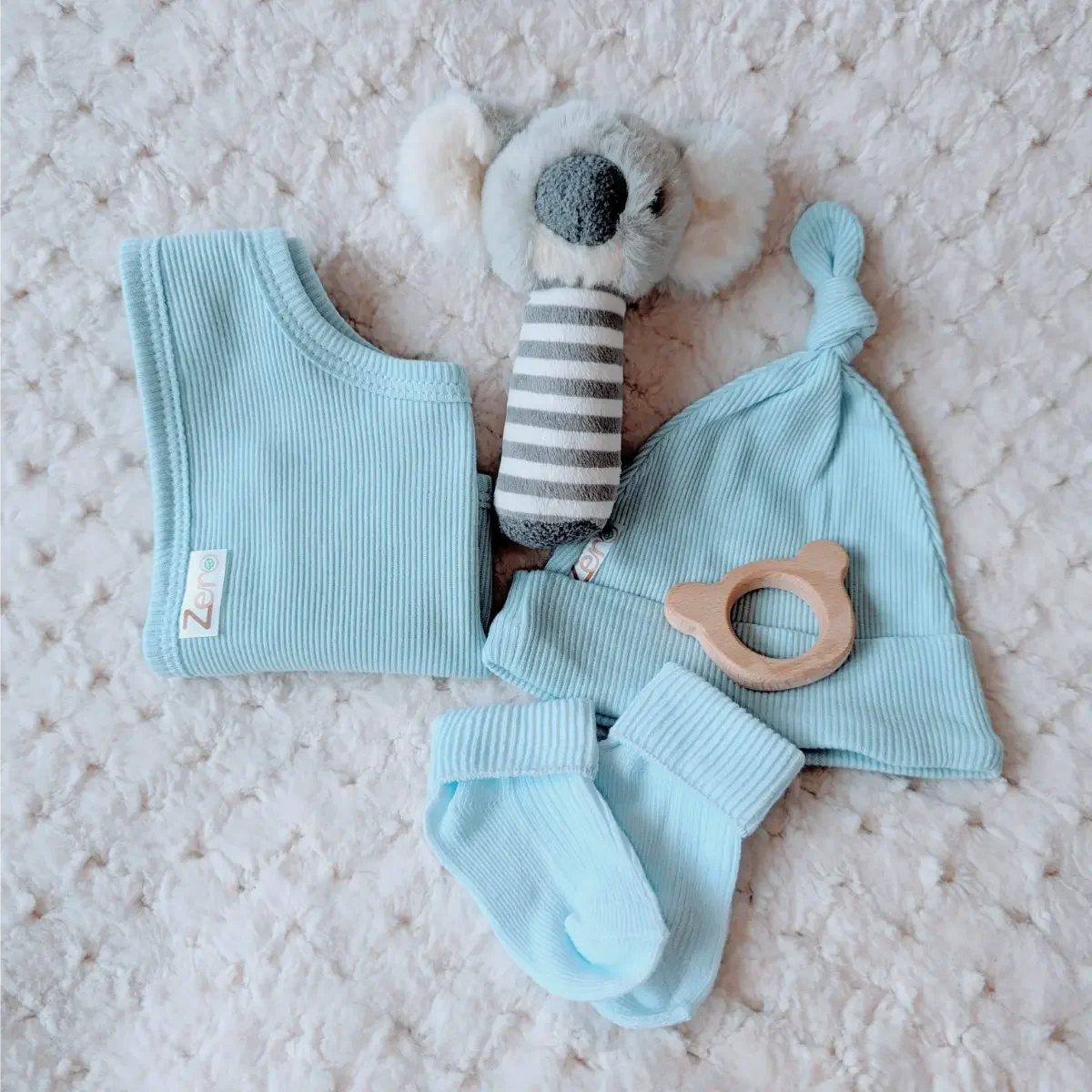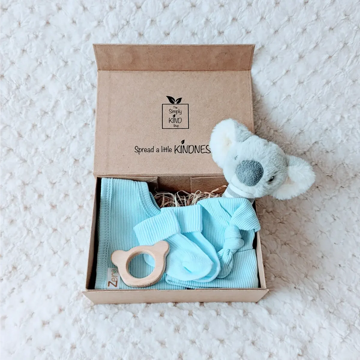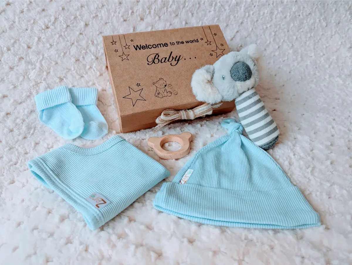 The Kozy Koala Small Gift Set is a beautiful, eco-friendly gift, perfect for celebrating the arrival of a baby boy. This thoughtful set includes a soft Keeleco koala rattle, made from recycled plastic bottles, a ribbed knotty hat (0–6 months) and a matching ribbed bib (0–6 months), both crafted from 100% recycled cotton. To complete the set, there are cosy blue turnover socks (0–3 months) made from pure cotton and a smooth beechwood koala teether to soothe teething gums. Presented in a natural kraft gift box with the option to personalise with baby’s name and milestone details, this sustainable collection combines practicality with keepsake charm. Gentle, stylish and planet-friendly, it’s the perfect present for newborns, christenings or baby showers.