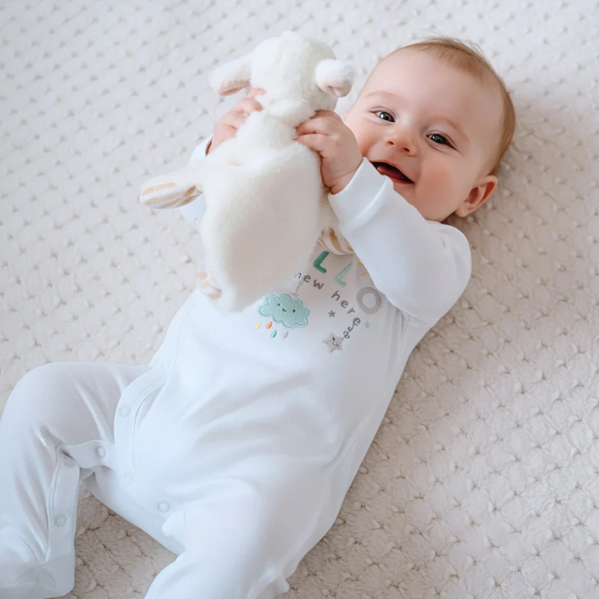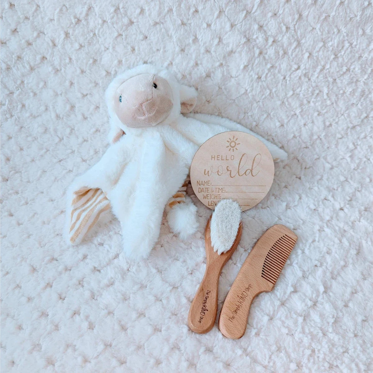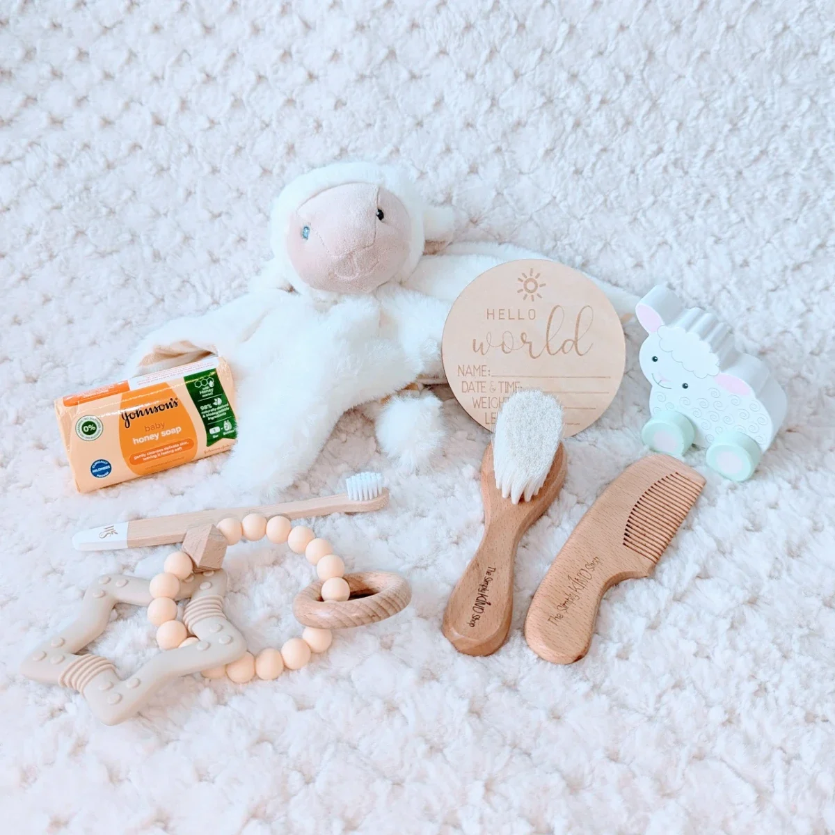 The Lullaby Lamb Large Gift Set is a luxurious, eco-friendly collection designed to celebrate the arrival of a newborn with both charm and practicality. At its heart is a soft Keeleco lamb comforter made from recycled plastic bottles, accompanied by a breathable 100% cotton cellular blanket – perfect for keeping baby cosy in spring. The set also includes a soft cotton “Hello World” sleepsuit (0–3 months) and a beechwood milestone plaque to mark those first special moments. Everyday care is covered with a gentle wooden hairbrush, natural comb, Johnson’s honey soap bar for sensitive skin, and a bamboo baby toothbrush with super-soft fibres. To complete the collection, a luxury silicone and wooden teether and a delightful wooden push-along lamb toy provide playtime and comfort. Beautifully presented in a natural kraft gift box, this set is the ultimate sustainable newborn gift.