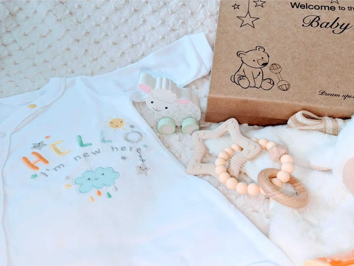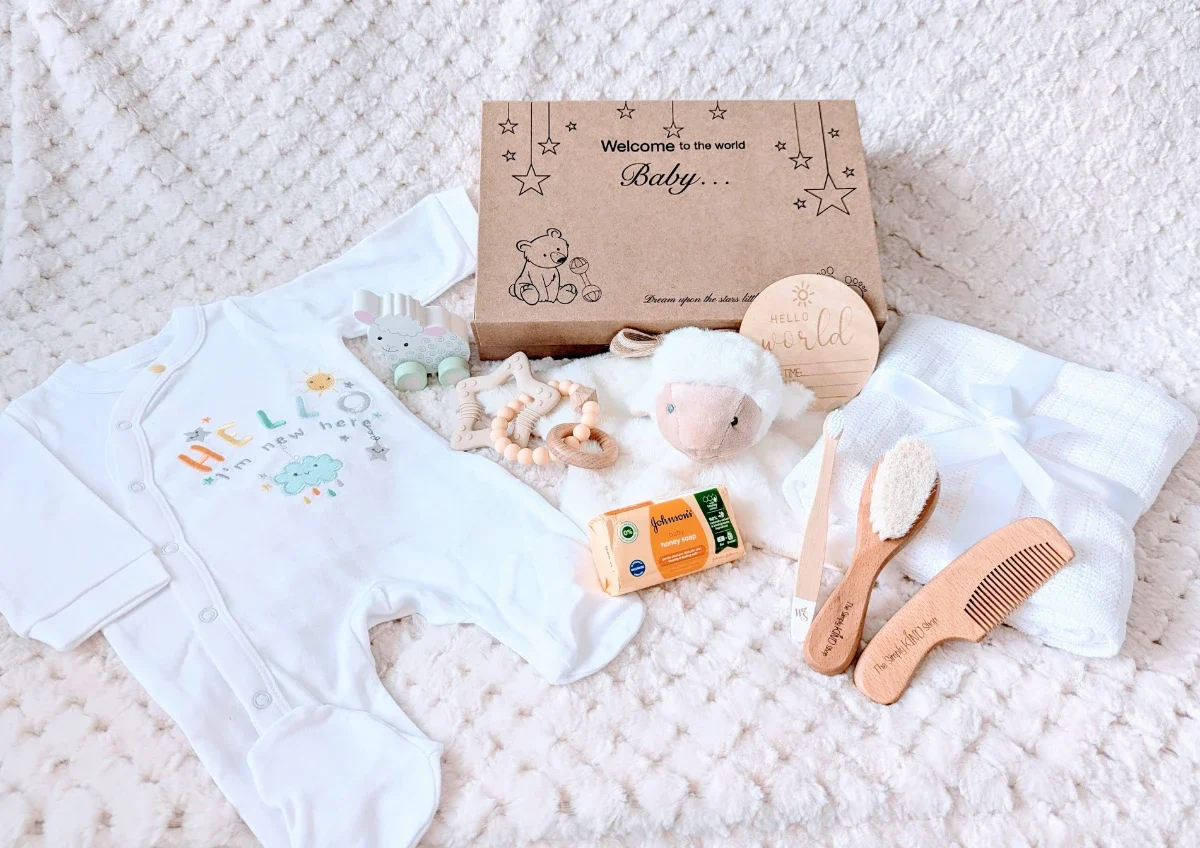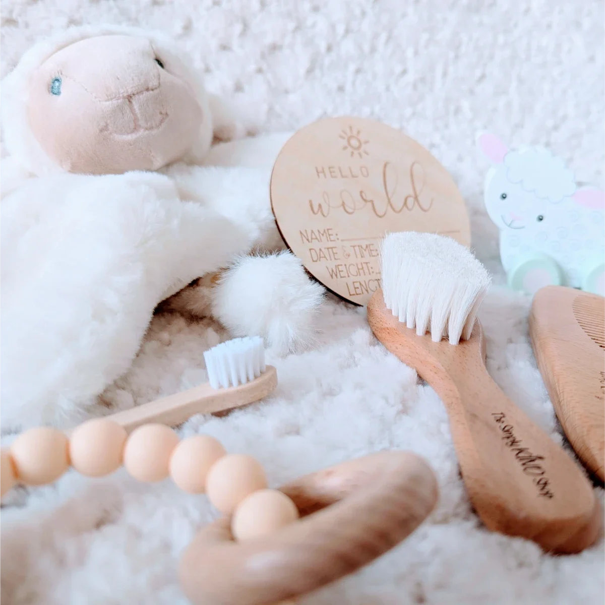 The Lullaby Lamb Large Gift Set is a luxurious, eco-friendly collection designed to celebrate the arrival of a newborn with both charm and practicality. At its heart is a soft Keeleco lamb comforter made from recycled plastic bottles, accompanied by a breathable 100% cotton cellular blanket – perfect for keeping baby cosy in spring. The set also includes a soft cotton “Hello World” sleepsuit (0–3 months) and a beechwood milestone plaque to mark those first special moments. Everyday care is covered with a gentle wooden hairbrush, natural comb, Johnson’s honey soap bar for sensitive skin, and a bamboo baby toothbrush with super-soft fibres. To complete the collection, a luxury silicone and wooden teether and a delightful wooden push-along lamb toy provide playtime and comfort. Beautifully presented in a natural kraft gift box, this set is the ultimate sustainable newborn gift.
