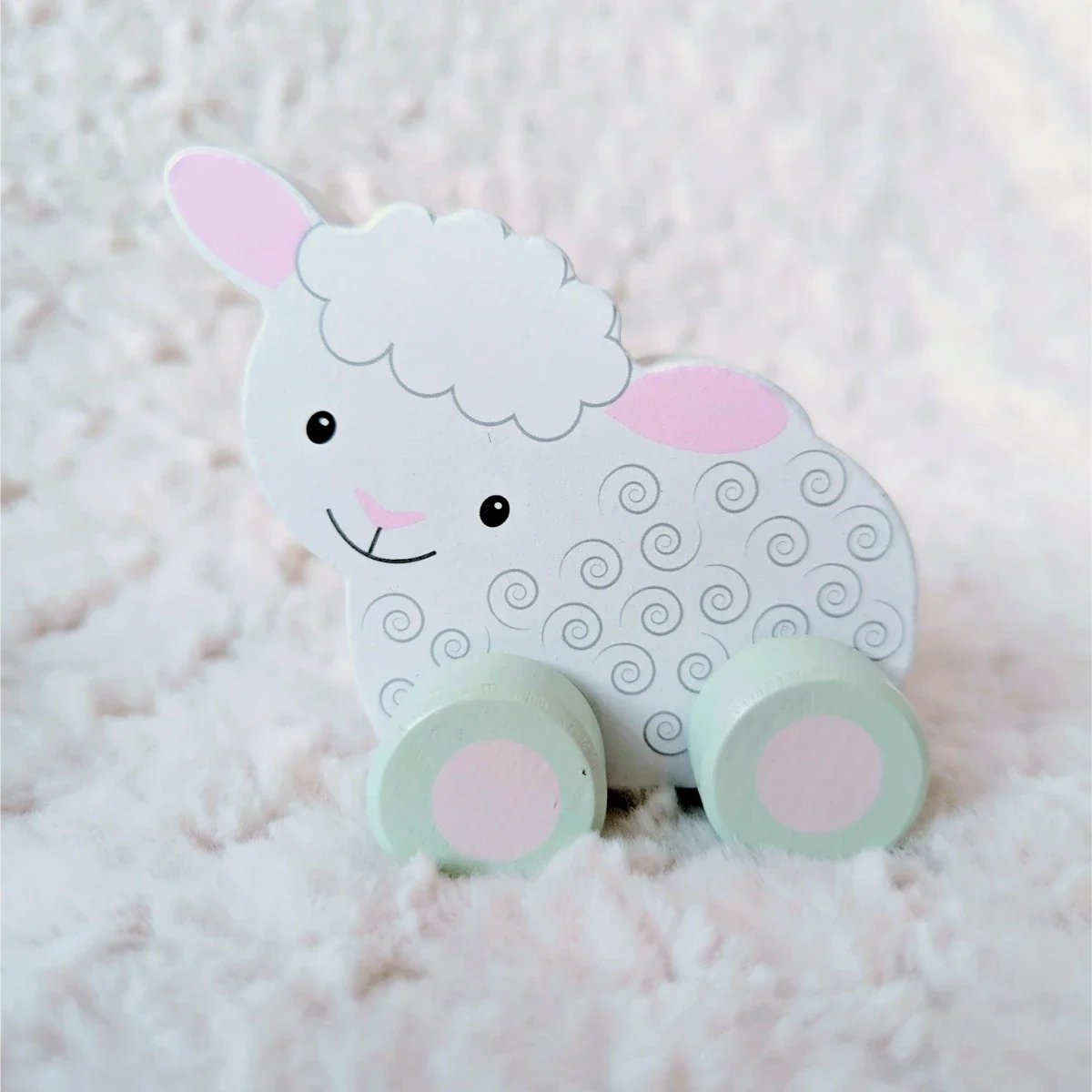 Wooden push-along toy: small natural wood, colour-painted lamb roll-along toy